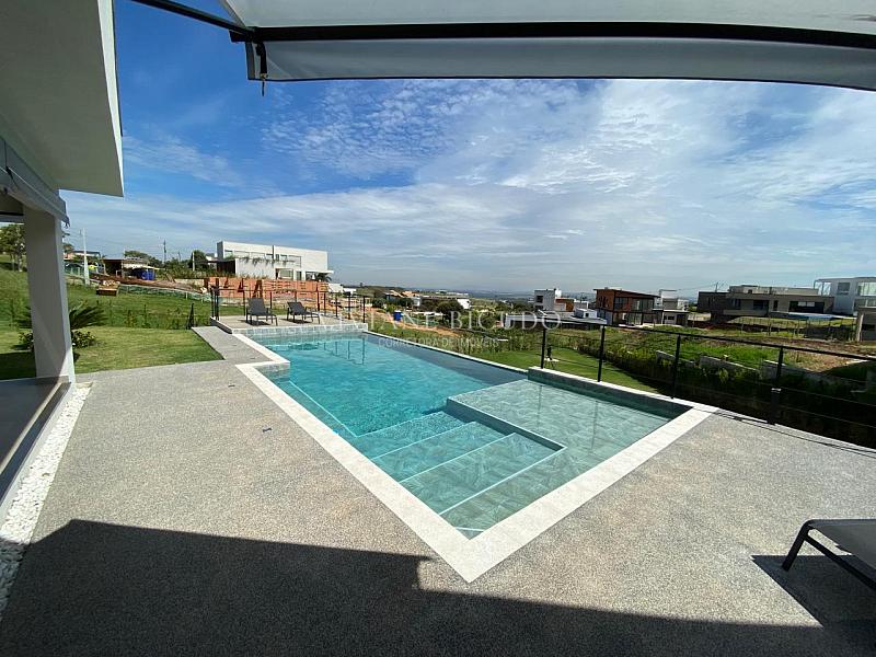 Piscina com prainha, piso externo em revestimento fulget e aquecimento solar SOLETROL;